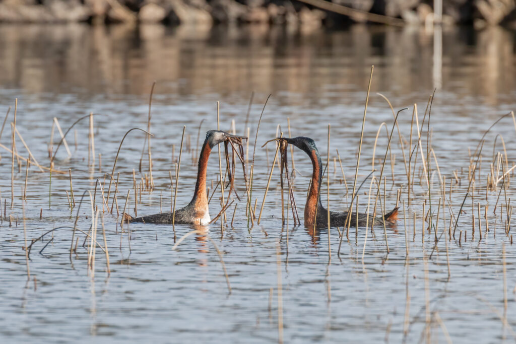 Los Hualas (también llamados «Macá Grande»), vocalizaban, se sumergían y en un momento se enfrentaron con algas en los picos, me imagino que pensando en el armado del nido… aunque no prosperó más de allí.