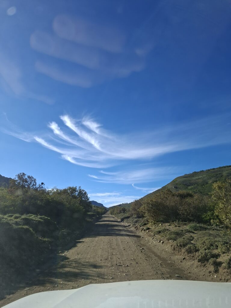 El día comenzaba con unas bellas nubes adornando el cielo azul. Estas nubes se llaman «Cirro unicinus». Generalmente se ven cuando se aproximan frentes cálidos (hoy la temperatura llegó a 20 grados). Están en la troposfera y significa que una precipitación se aproxima. (hay pronóstico de lloviznas para mañana por la noche).