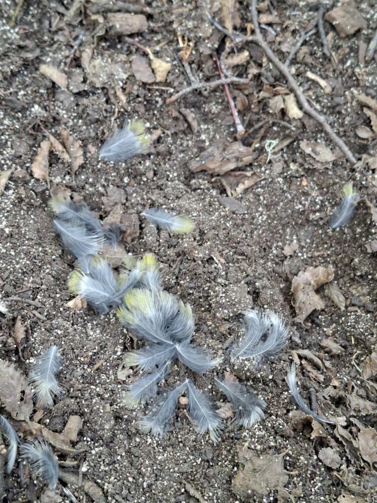 Continué caminando, no solo buscando a los carpinteros sino atento a cualquier cosa interesante para registrar. Subí montículos, crucé claros de bosque y en medio del sendero, me encontré con un plumerío. Los colores delatan rápidamente la especie atacada…