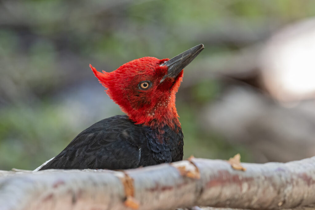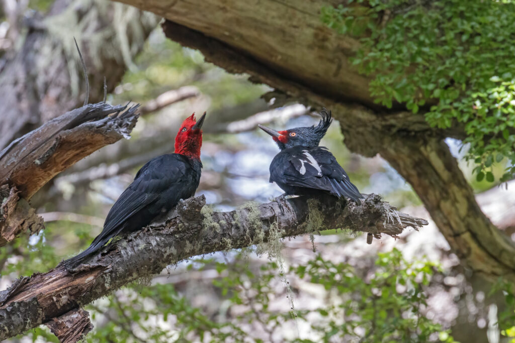 Ella luciendo un radiante plumaje negro, con un largo rulo sobre su cabeza y él con su característica cabeza roja y mini jopo.