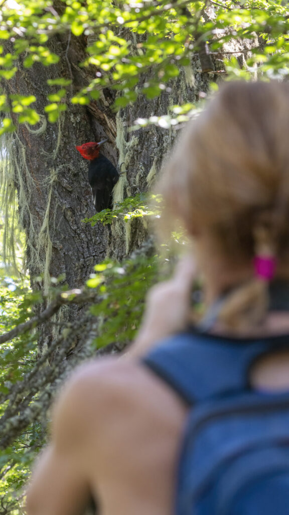 Lo primero que hicimos fue buscar a la familia de Carpinteros y la volvimos a encontrar. Prestando mucha atención al silencio del bosque y guiándome por sus vocalizaciones y golpes en busca de alimento dimos con ellos. Le dije a mi vieja: «quedate con ellos que voy a ver si encuentro a la Lechuza y si la encuentro te vengo a buscar».