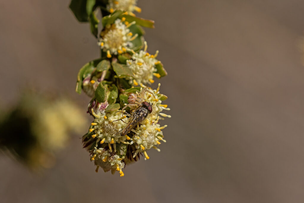 Pero lo que más me divirtió fue lo siguiente: hacía muchísimos años que no veía una Araña Cangrejo. La familia Thomisidae cazan esperando y camuflándose en las flores, no hacen tela. Una vez que el insecto se posa para consumir el néctar ellas lo agarran.