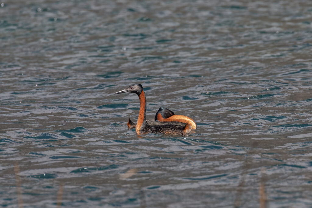 Por último y ahora si para cerrar el día, una pareja de Huala (Podiceps major), que anduvo vocalizando durante la tarde, nos permitió algunas fotos antes de retirarse suavamente contra el oleaje.