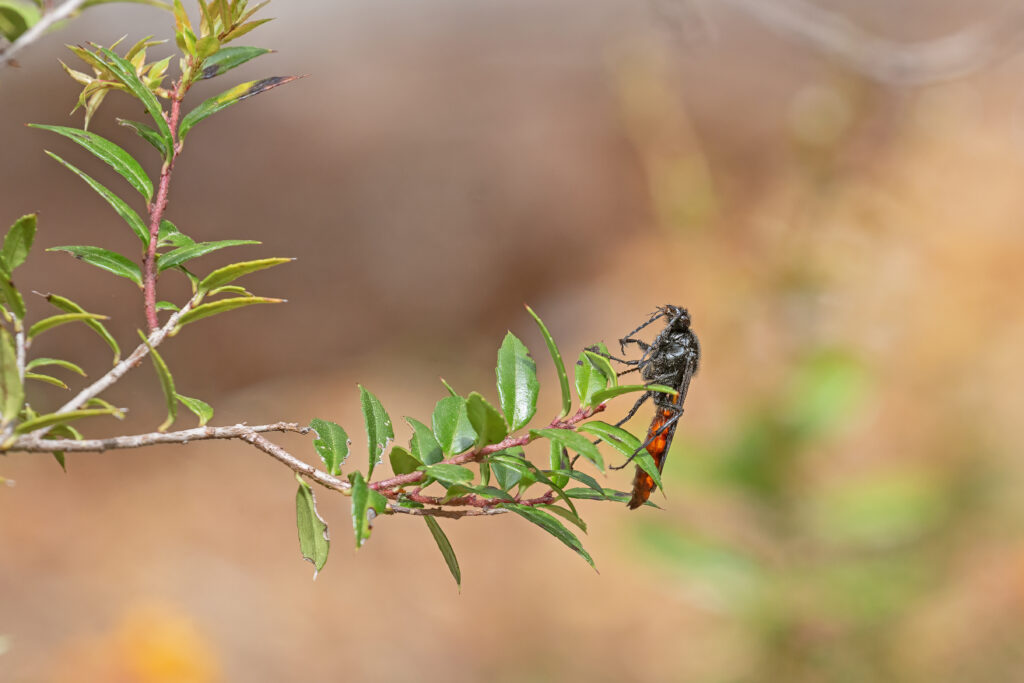 - Comportamiento: Tienen hábitos parasitoides. Las hembras buscan un anfitrión (probablemente larvas de otros insectos en el suelo) al que inmovilizan con su aguijón y donde depositan sus huevos. Los machos, una vez encuentran a una hembra, la «secuestran» y copulan en vuelo, tras lo cual el macho suele morir.