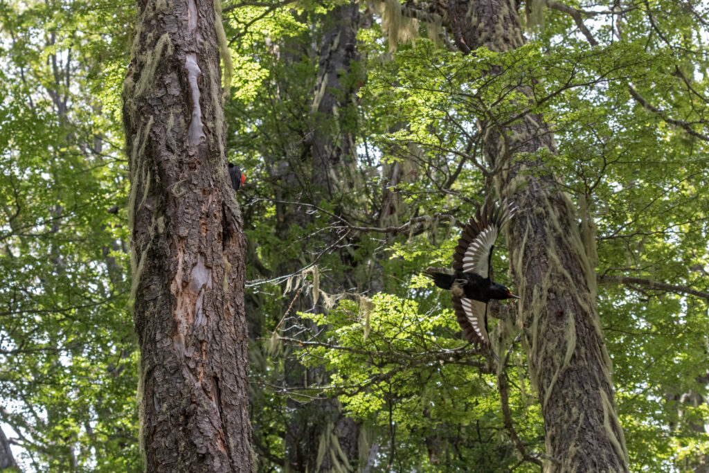 Luego de este vuelo, comencé a escucharlo vocalizar muy fuerte, incluso era un sonido casi lastimero, como de tristeza, pero no… se puso agresivo, y de repente se reveló el motivo: un Matamico Blanco (Phalcoboenus albogularis). No llegué a fotografiarlo y por suerte para los carpinteros se fue bastante rápido. Es la primera vez que lo veo en este bosque.
