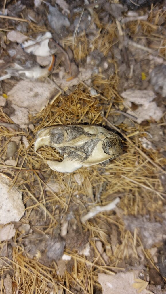 El acercamiento a otra zona, permitió descubrir el nido de una Lechuza de Campanario. Aunque no la vimos a ella, el suelo estaba lleno de egagrópilas, huesos (sobre todo de tuco tuco), y algunas plumas.