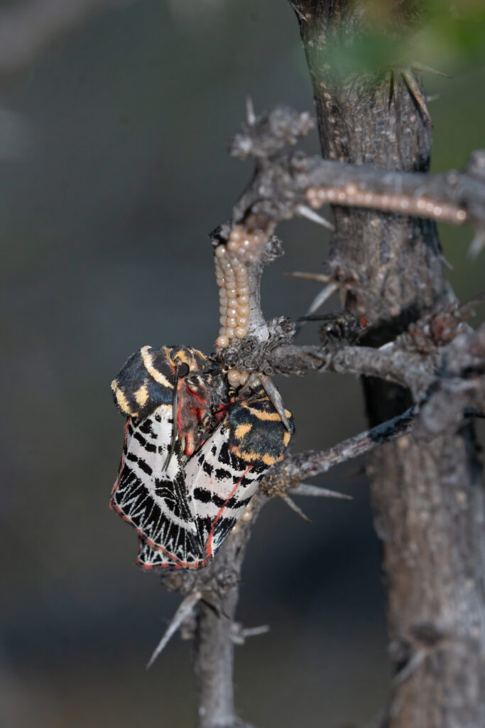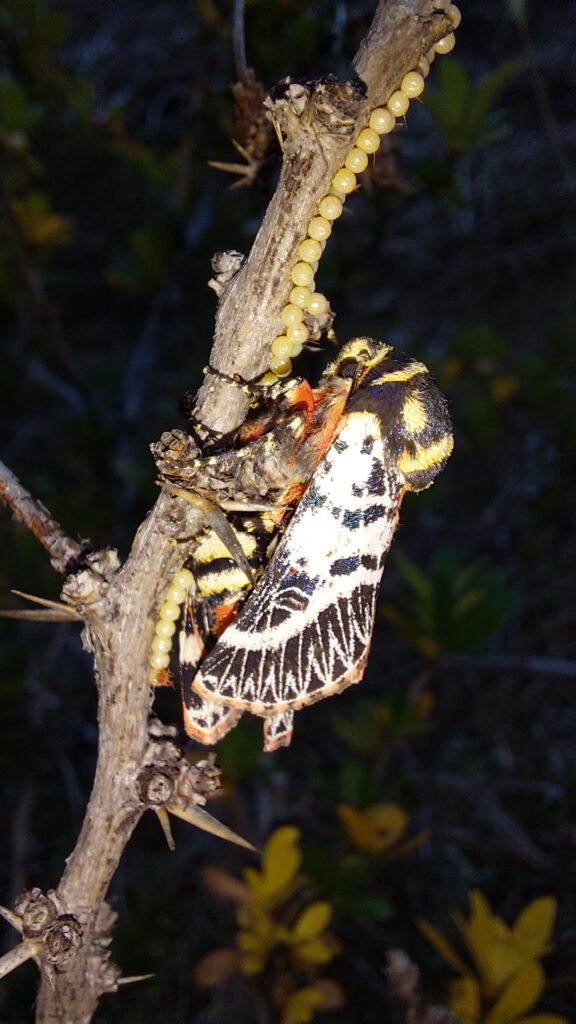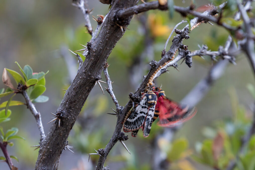 ¿Casualidad?, ¿suerte?, ¿sensibilidad? nos pasó algo muy loco: una huella fresca de ciervo nos hizo detener la caminata, a unos 15 metros salió de entre los ñires, corriendo un macho adulto, eso hizo que frenáramos un segundo, lo que permitió centrar la atención en una muy llamativa polilla de color rojo furioso, que fue volando hacia una rama… donde había 2 más posadas y que, al observar en detalle, tenían huevos.